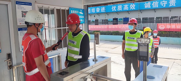“师傅,对着酒精测试仪先吹一下”,5月16日下午2时,八分公司泰安王府花园项目在实名制通道对施工工人进行上岗前酒精检测。